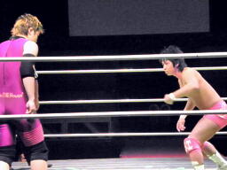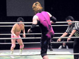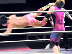 矢野ストンピング、石井エルボー。矢野ボディにパンチ(左写真)、ニーリフト。コーナーで踏みつけ。矢野石井を場外に出す、石井すぐにリングに戻る。