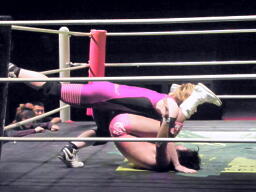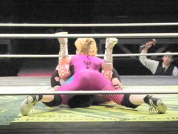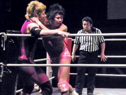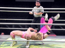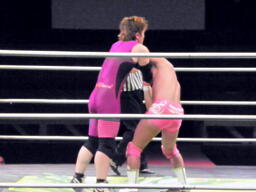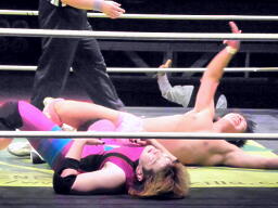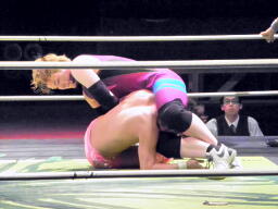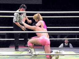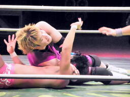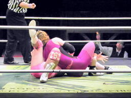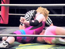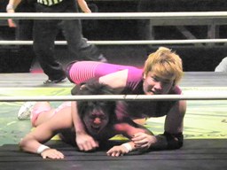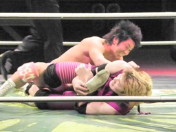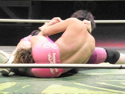 ロープワークから矢野押さえこむ(右写真)、カウント2。10分経過。