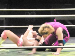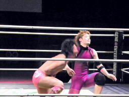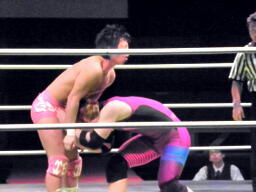 石井ヘッドシザーズに切り返す(右写真)、矢野はネックスプリングで脱出。矢野カニばさみ、石井足を固められる前にロープ。