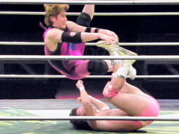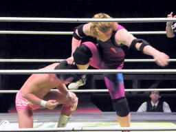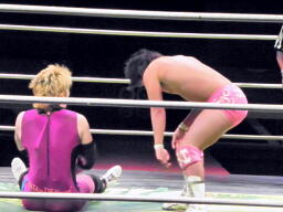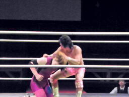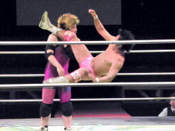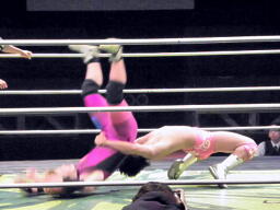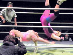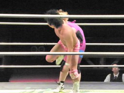 フィッシャーマンズバスター(右写真)、カバーに行こうとするところを矢野首固め、カウント2。