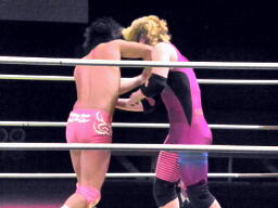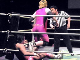 矢野張り手、バック取ると外道クラッチ(左写真)、カウント2。