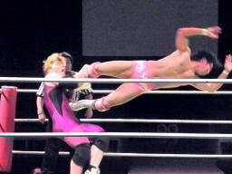 矢野「啓ちゃんボンバー!」と叫んでロープに飛ぶが石井の目の前に座り込んで張り手(左写真)、コーナーに上って「コッチだよ!」と叫んでミサイルキック、カウント2。