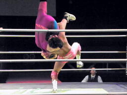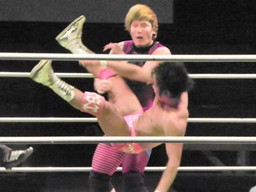 ケイちゃんボンバーをかわして投げっぱなしジャーマン(右写真)。