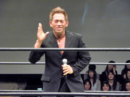 休憩明けのリングには中澤マイケルCEO(右写真)。「塩」コールに対し「サイレンス!みんな、発音がちょっと違うぞ!」