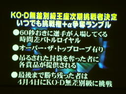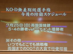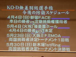まずは今後のKO-D無差別級に関するスケジュール(左写真)。4/4の新宿FACEで今日のメインの勝者とセミの勝者が防衛戦。5/4にもその勝者が防衛戦。5/23と30で昨年同様両国での挑戦者を決めるトーナメントが。30日は「決勝戦」となっているが「2回戦から決勝戦まで」だそうだ。