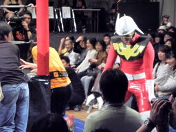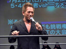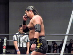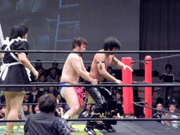 最初の入場は佐藤光留。安藤あいかがステージで怯える。こないだ襲われたのがトラウマになったか?2番目は澤宗紀。なにげに好カード。張り手の打ち合い(左写真)、