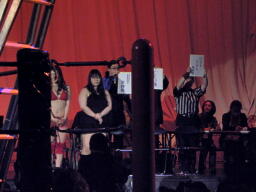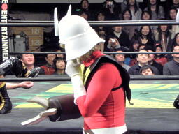 澤十字(左写真)、佐藤ロープ。3番目アブ・ノーマルとコールされる。しかし入ってこない。ちなみにマイケルはまだリング下で失神中。アブ・ノーマル時間内に入ってこないため失格(2分0秒)。