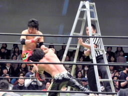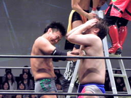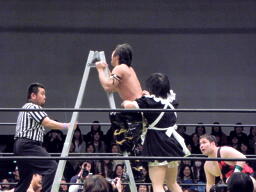 KUDOがラダーを立てて上る、佐藤が阻止(右写真)。