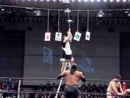 高梨と安部がラダー上で封筒の取り合い(左写真)。