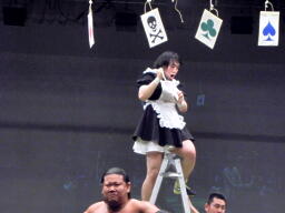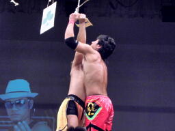 そこに11番目のササキアンドガッバーナがミサイルキック、安部が♠の封筒を落とす(右写真)。リング下に落ちた封筒をヤゴー・アズナブルがGET。「ドントムーヴ」がかかる。