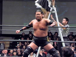 7番目大鷲の入場中に佐藤がラダーに上る(右写真)。