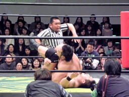 関本至近距離からのラリアット、カバー(右写真)、カウント1。