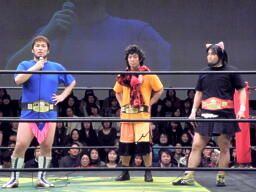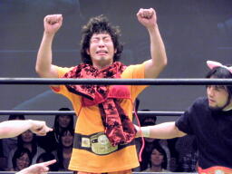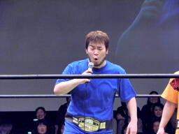 ディーノ「ダマされないぞ!そんな戯言に!」高木リングに戻り「本日はDDT13周年興行にお越しいただきましてありがとうございます。ベルトは依然として他団体に流出したままですが、DDTはまだここにある!」(右写真)
