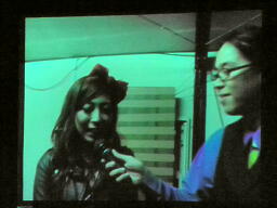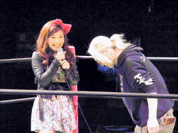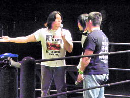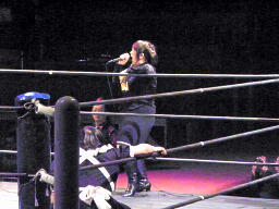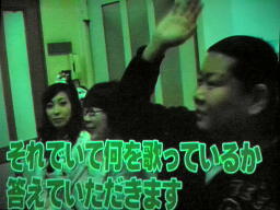ということで、佐藤光留がヘッドフォンから流れる洋楽をそれに合わせて歌い、3人が何の曲か当てることに。なんでクイズなんだ。大鷲「もう全くデートじゃなくなってるんですけど。それと、これやってんのDDT所属外だよみんな。」(左写真)大鷲もデート企画の主役のはずだったのにただのガヤに。