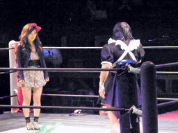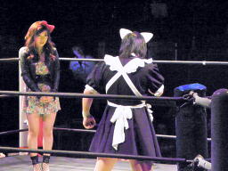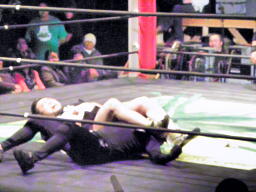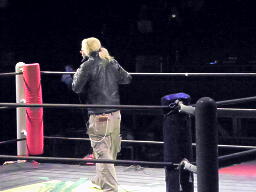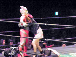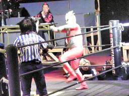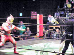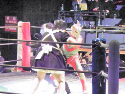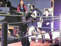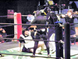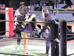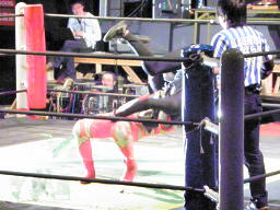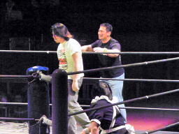 ロビンコーナーに上がるが、また遠いのでリングに降りる(左写真)。