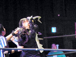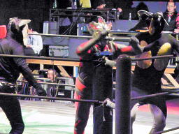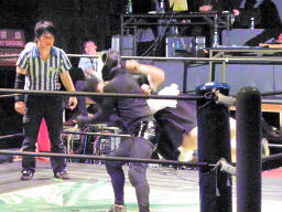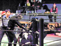 佐藤とロビンがダブルのクローズライン、メフィラスブレーク(右写真)。しかし戻ってきたところをダブルのワキ固めに。ゼットンがカット。