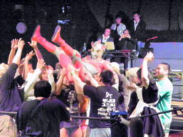 佐藤がシンディ・ローパーの「ハイスクールはダンステリア」に合わせて歌う(右写真)。