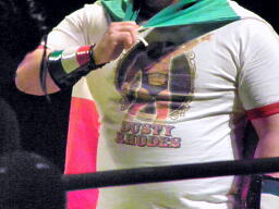 高尾ロープに飛ぶ、トーゴーカウンターのラリアット(右写真)、ガッバーナにタッチ。