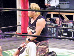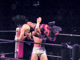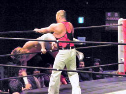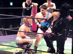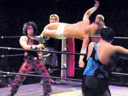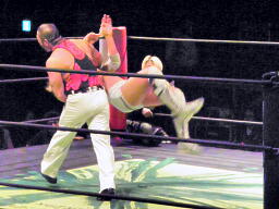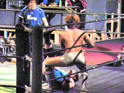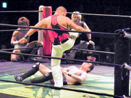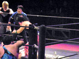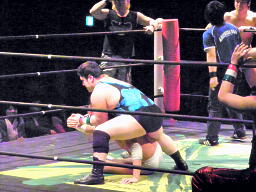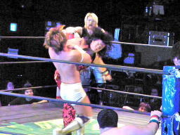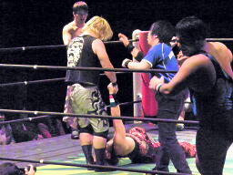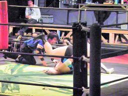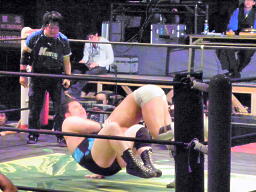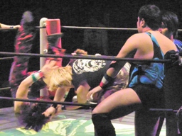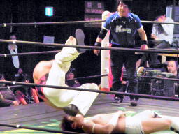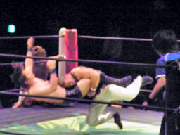 髪を踏んで手を引っ張り上げる(左写真)。これは痛そう。ウラノ場外に出す、高尾がスライディングキック。ウラノリングに戻してカバー、カウント2。