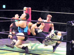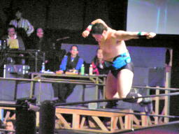 コーナーに上るとダイビングエルボードロップ(左写真)、これはウラノがカット。ガッバーナはアントンにタッチ。