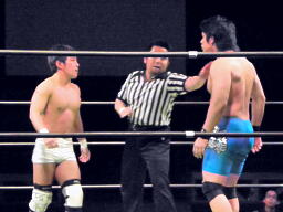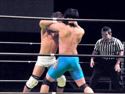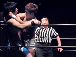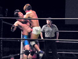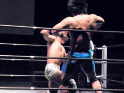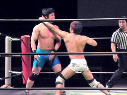 ロックアップ(左写真)、彰人がロープに押し込む、佐藤は体勢入れ替える、彰人さらに入れ替えてエルボー。