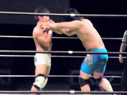 佐藤逆水平3連打(右写真)、彰人もチョップ打ち返す。
