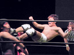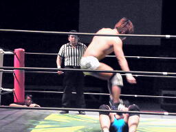 彰人ロープに振って突っ込む、佐藤ロープつかんで顔面にキック、エプロンに出て足を払うとコーナーに飛び乗ってダイビングフットスタンプ(左写真)。しかしこrで自分の足首を痛めた様子。
