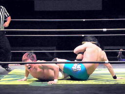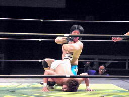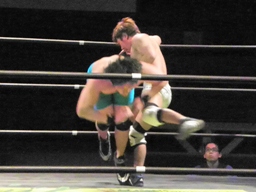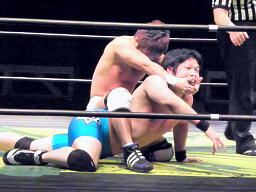 彰人もう一発T-bone、佐藤ブロックして張り手、ロープに飛んでSEXボンバー(右写真)、カウント2。