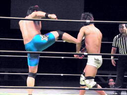 彰人コーナーに振る、佐藤反転ミサイルキック(右写真)。佐藤コーナーに上ってもう一発ミサイルキック、カウント2。