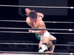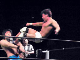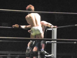 彰人肩に担いでターンバックルに叩きつけると(右写真)反転してスパインバスター。これはいい。