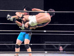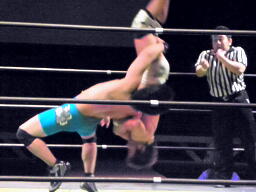 佐藤クロスボディ、彰人キャッチして(左写真)水車落とし、カウント2。