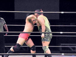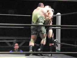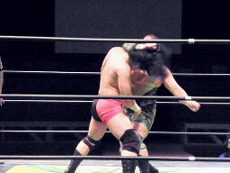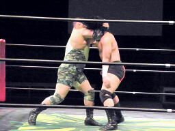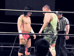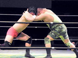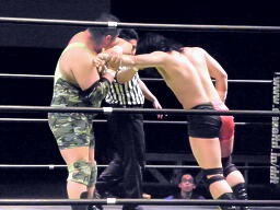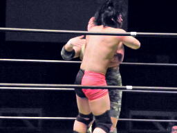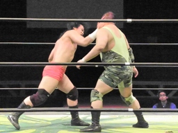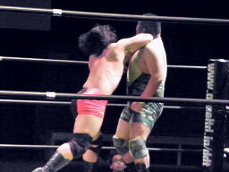 ロックアップ(左写真)、入江がロープに押し込む、ブレーク。再度ロックアップ、また入江がロープに押し込む、ブレークする際にパンチ、佐々木かわす。