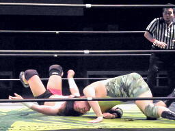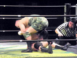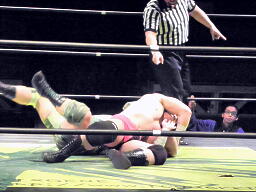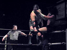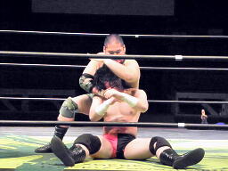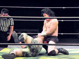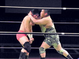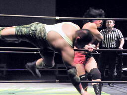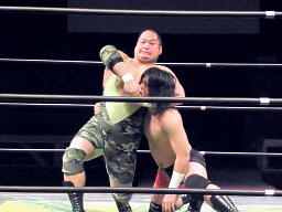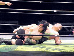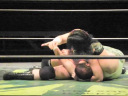 佐々木ヘッドロックからフライングメイヤー、グラウンドヘッドロック(左写真)。入江エビ固めに、カウント1。両者立ち上がる。
