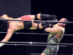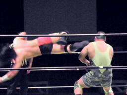 入江雪崩式テディベア狙ってコーナーに上る、佐々木起き上がって雪崩式ジャーマンに(右写真)。15分経過。