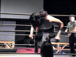 入江ロープに飛ぶ、佐々木ドロップキック(右写真)。入江ハンマーパンチ、ボディスラムからカバー、カウント2。