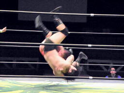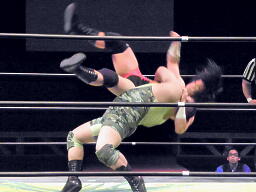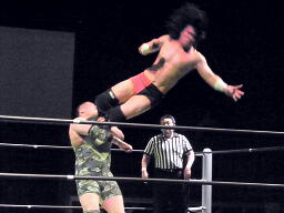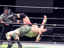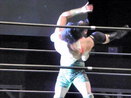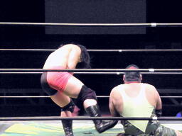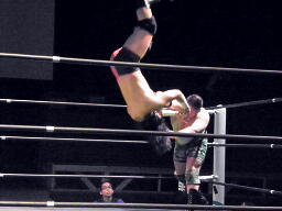 入江逆水平(左写真)、バックドロップ狙うが佐々木ブロック。入江はコーナーに振って突っ込む、佐々木かわして延髄蹴り。