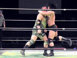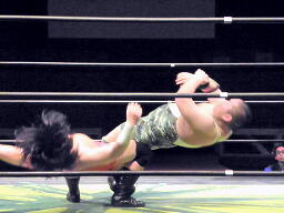 佐々木ロープに振る、入江切り返してラリアット、佐々木かわしてコルバタ(左写真)、カウント2。