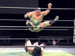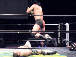 佐々木コーナーに上るとヒットマン式ダイビングエルボードロップ(左写真)、カウント3。