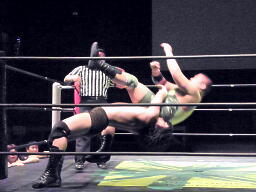 ロープに飛ぶ、入江キャッチしてパワースラム(右写真)。