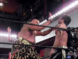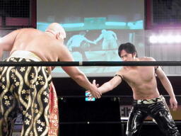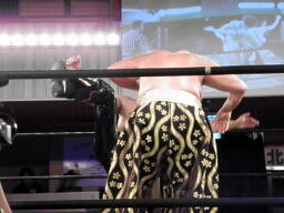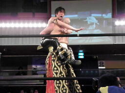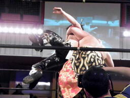 KUDOは腰を強打し場外でダウン(左写真)。カウント15で星誕期が戻す。星誕期コーナーに振って突っ込む、KUDOそのまま場外エスケープ。