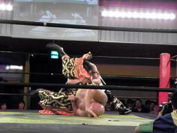 星誕期突っ込む、KUDO回転エビ固め(左写真)、星誕期つぶす。カウントは2。