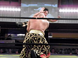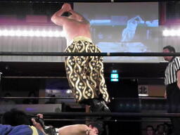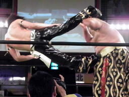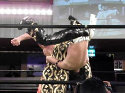 KUDOキック連打、スピンキックで尻餅つかせるとバズソーキック(右写真)、カウント2。KUDOドロップキックで場外に落とすとトップロープ越えのプランチャ、星誕期キャッチ、場外でボディスラム。