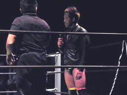 マイケルストンピング、ダウンしたHARASHIMAをジャケットで乱打(右写真)。松井レフェリー「反則取るぞ!」