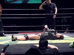 ヤゴウバズソーキック、カウント2。デスペナルティの体勢に(右写真)。
