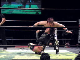 石井切り返してブレーンバスター(左写真)、カウント2。石井ソバット、ロープに飛んでジャンピングニーアタック、カウント2。