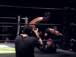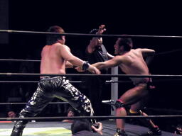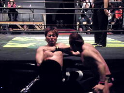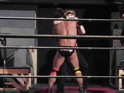 マイケルは場外に出てHARASHIMAの両足を取るとヘンタイトレイン。さらに場外で逆水平(左写真)