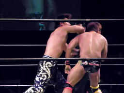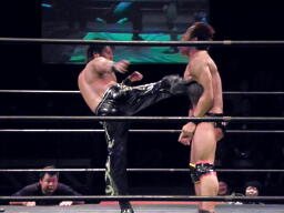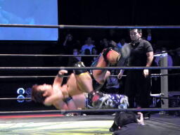 マイケルは山嵐流バックフリップ狙う、HARASHIMAブロックしてハイキック、マイケルかわすがHARASHIMA2回目でヒット(右写真)。
