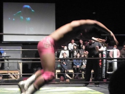 それでもロープに振ろうとするのを切り返して肩に担ぐとバックフリップ(右写真)。