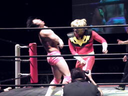 石井ドロップキックでヤゴウを場外に落とすとプランチャ、しかしかわされる(右写真)。ヤゴウは場外で正拳、鉄柱攻撃。先にリングに戻る。