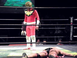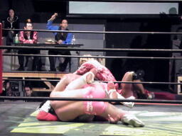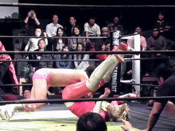エプロンに戻った石井をロープの間から引っぱり込むとイーヴンフローDDT(左写真)、カウント2。